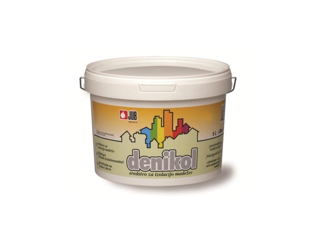 Denikol je prostředek pro izolaci skvrn způsobených látkami, které jsou rozpustné ve vodě, jako např. nikotin, saze, skvrny po zatékání, zbytky mastnoty apod. Denikol je ředitelný vodou a bez výrazné vůně. Může se nanášet na různé pevné a suché vnitřní podklady – zejména štukové omítky stěn a stropů a sádrokartonové desky. Není účinný na plochách natřených izolačními barvami obsahujícími organická ředidla. Na suché ošetřené podklady, se musí nutně nanést ještě jedna nebo dvě vrstvy některé z krycích malířských barev (např. Jupol Classic). Barva: přírodní bílá. Způsob aplikace: váleček, štětec Nářadí očistit vodou. Zabránit kontaktu s pokožkou a očima. Spotřeba: 150 - 400 ml/m2 v jedné nebo ve dvou vrstvách Balení: 5 LDoplňkové parametry