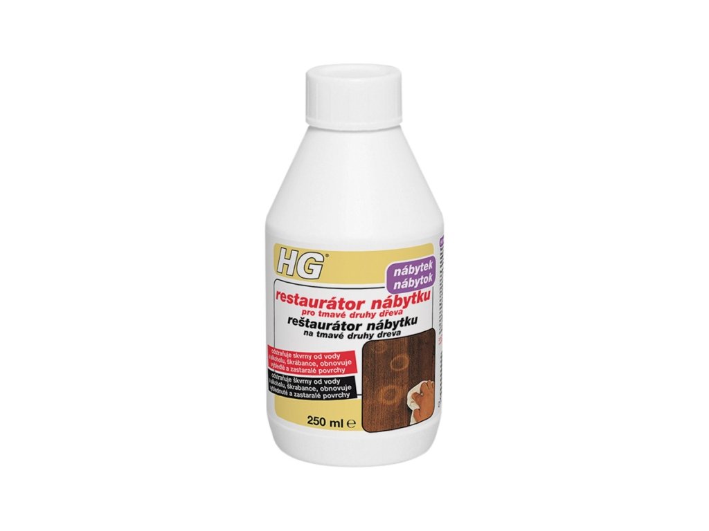 Účinný restaurátor, který dokonale vyčistí dřevěný nábytek. Vhodný na lakované, mořené, voskované i neošetřené dřevo.Přípravek HG restaurátor nábytku pro tmavé druhy dřeva je vysoce kvalitní ošetřující přípravek pro mořený, lakovaný, olejovaný, voskovaný nebo nijak neošetřený nábytek. Skvrny od tekutin, jako jsou například kruhy od vody a alkoholu, zmizí, zašedlé a vybledlé povrchy získají zpět svou přirozenou barvu, škrábance budou zamaskovány. Návod k použití: Přípravek bohatě naneste v pravidelných pruzích a nechejte 6 – 10 hodin působit. Na místa, kde se přípravek plně vstřebá, aplikaci přípravku zopakujte. Po uplynutí doby působení přebytečný materiál odstraňte pomocí čistého hadru.Doplňkové parametry