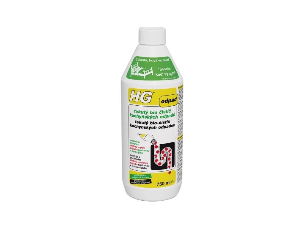 Speciálně vyvinutý biočistič, který pomocí enzymů a mikrobů uvolňuje odpady ucpané tukem a zbytky jídla. Jako následek splachování zbytků jídel, mastnot a olejů do odpadů, jsou velmi častým jevem silně ucpané kuchyňské odpady. HG tekutý bio čistič kuchyňských odpadů působí na základě přírodních mikroorganismů, které požírají mastnotu. Tím zcela přírodní cestou uvolní ucpaný odpad. Mimo uvolnění již ucpaného odpadu má přípravek HG tekutý bio čistič kuchyňských odpadů díky speci?ckému složení také preventivní působení, čímž předchází ucpání odpadu. Návod k použití: Pokud možno, nechejte před aplikací protékat odpadem trochu teplé vody, poté nalejte 3 dcl přípravku do odpadu. Pro aktivaci přípravku je nutné v zápětí nalít do ucpaného odpadu cca. 200 ml teplé vody. Než necháte odpadem opět protékat vodu, nechejte nejdříve přípravek 6 až 8 hodin působit. Poté bude váš odpad opět zcela volný. Pro prevenci ucpání odpadu, nebo pro odstranění nepříjemných pachů nalijte 2x do měsíce trochu přípravku do odpadu a nechejte nejlépe přes noc působit. Vhodné i pro bioseptiky.Doplňkové parametry