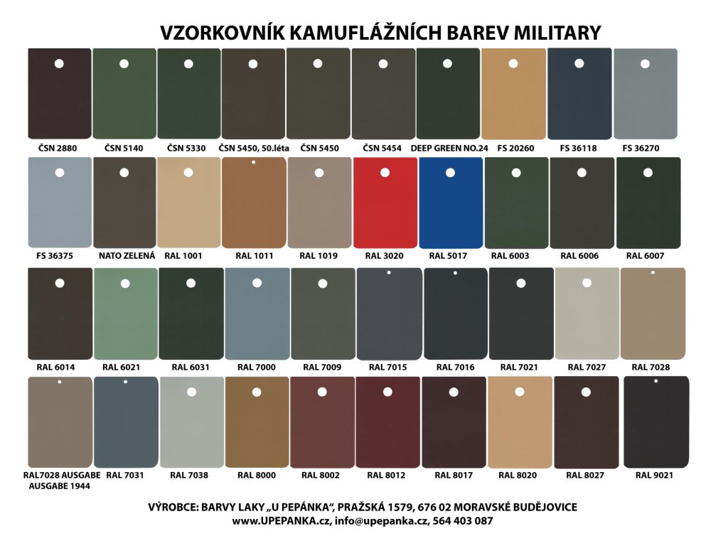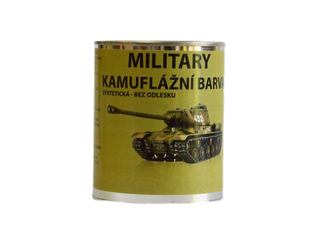 Kamuflážní barva MILITARY v plechovce určená pro vojenské účely, s vysokou krycí schopností a dobrou přilnavostí na kovové, dřevěné, plastové, textilní povrchy a další podklady. Jedná se o rychleschnoucí verzi barvy na váleček nebo stříkací pistol. Barva je bez odlesku.- Označení materiálu K300