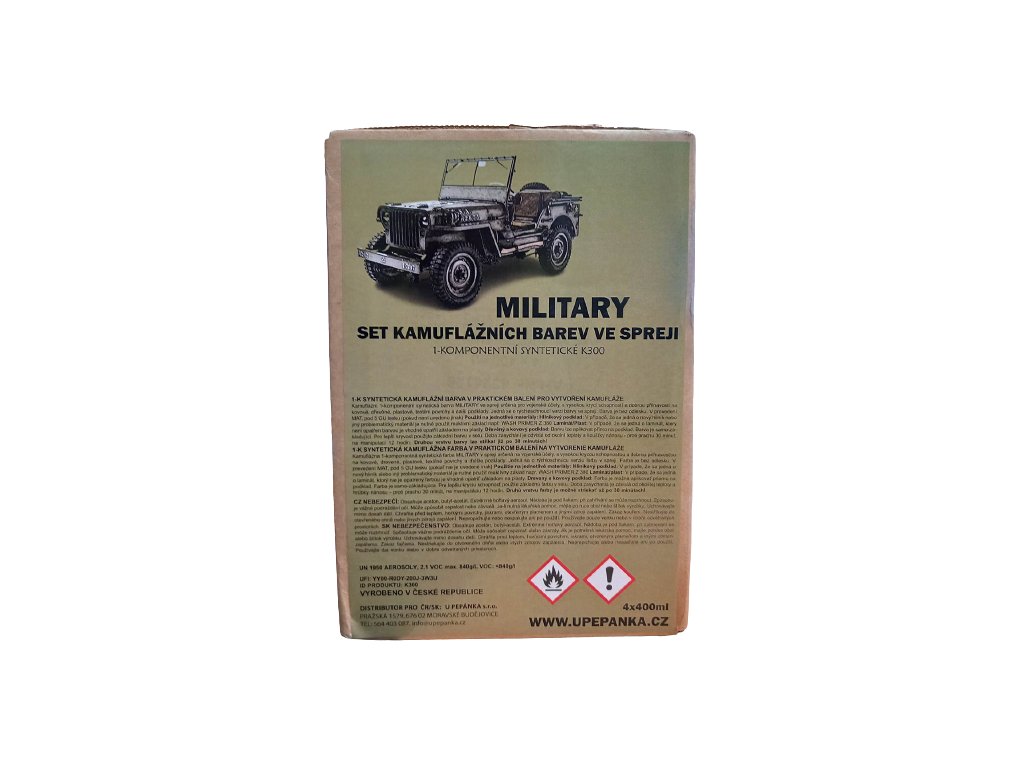 Kamuflážní barvy MILITARY ve spreji v balení 4x400ml pro vytvoření kamufláže německé armády WEHRMACHT. V setu naleznete odstíny ROTBRAUN, OLIVGRAU, DUNKELGELB a základová barva na dřevo, kov a další podklady. Tato kombinace je jedna z nejběžnější kamufláže německé armády za dob 2.světové války.- Barvy jsou vhodné pro profesionály i kutily