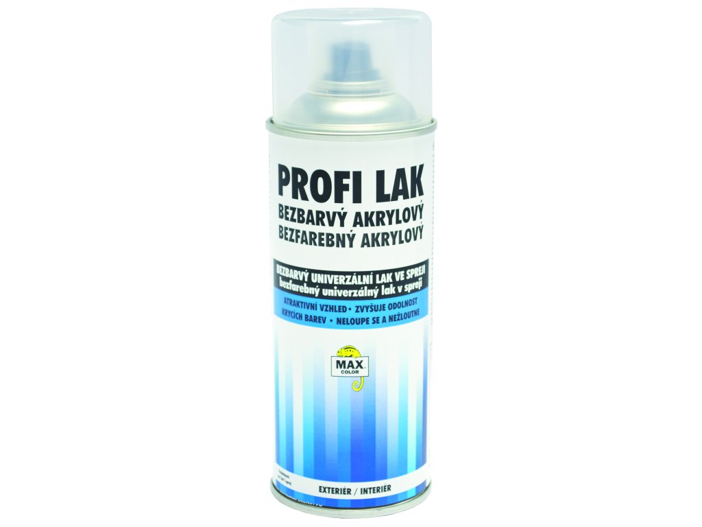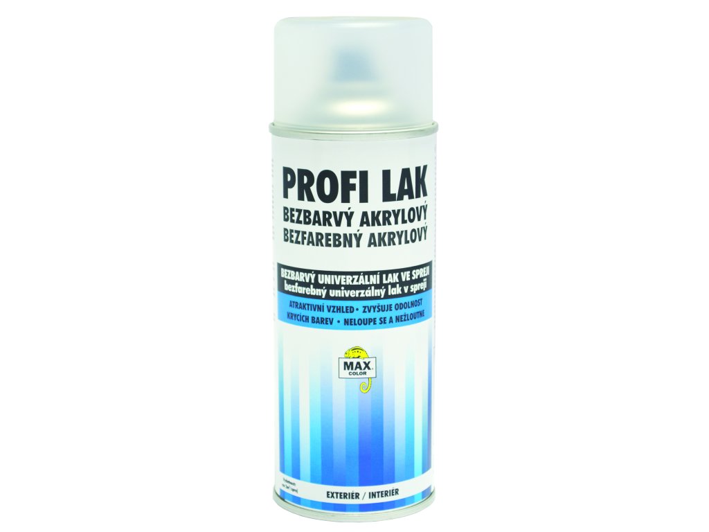 Bezbarvý akrylátový univerzální lak ve spreji se aplikuje na karoserii, papír, dřevo, kov a další materiály. Vytváří lesklý nebo matný vzhled, zvyšuje odolnost krycích barev. Neloupe se a nežloutne, je trvanlivý. Vyniká vydatností, je rychleschnoucí, nestéká po nastříkání. Lak se používá na různé kutilské práce, pro lakování modelů, sportovních potřeb, zahradního nábytku apod. Lak není určen k nátěrům, které přicházejí do přímého styku s potravinami, krmivy a pitnou vodou a k nátěrům dětského nábytku a hraček.- Objem 400ml