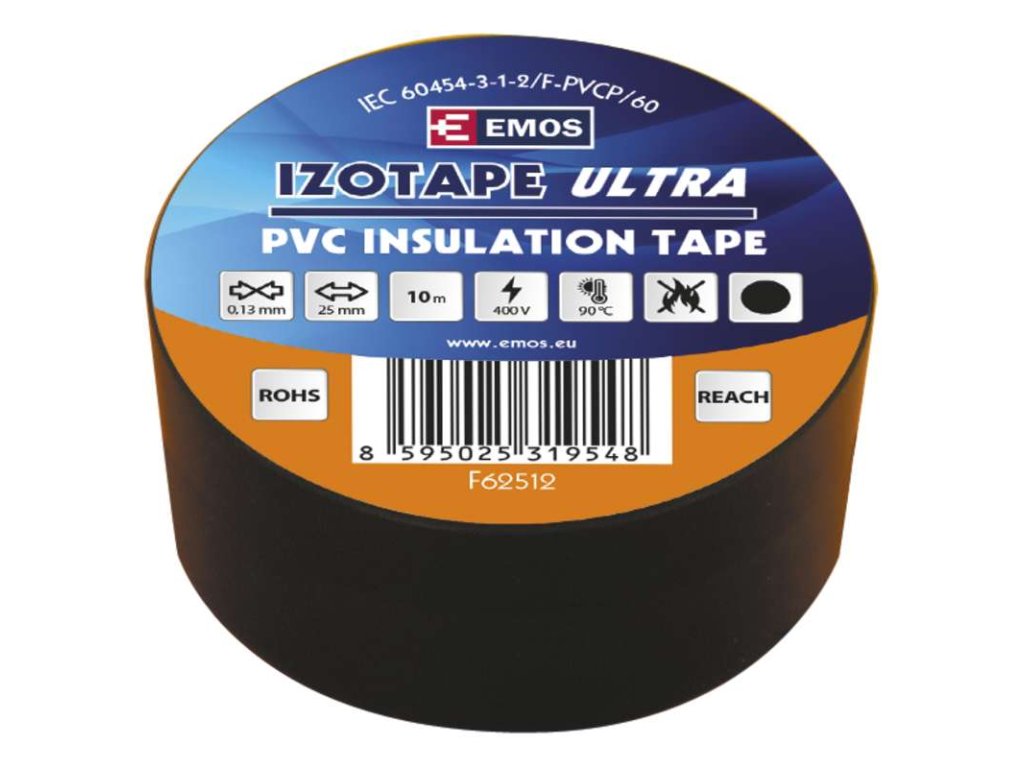 Páska elektroizolační, rozměr 25mmx10m, černá Parametry produktu typ pásky PVC šířka pásky 25 mm délka návinu 10 m tloušťka pásky 0,13 mm barva černá potisk bez potisku elektrická pevnost minimálně 40 kV/mm prodloužení minimálně 125 % elektrická pevnost po vlhku minimálně 35 kV/mm splňuje směrnici ROHS ano splňuje směrnici REACH ano rozsah pracovních teplot -25–90 °C materiál lepidla kaučuk integrovaná textilní síťka ne pevnost v tahu 150 N/10 mm odolné UV ano přilnavost k oceli minimálně 1,8 N/10 mm předpokládané použití izolace kabelů přilnavost k podkladu 1,5 N/10 mm vodotěsný spoj ano doporučená skladovací teplota 10–45 °C vyhovuje normě ČSN EN 60454-3-1-2/F-PVC/60 zkouška plamenem <1 sec samozhášivé ne vytváří tlakotěsný spoj neDoplňkové parametry