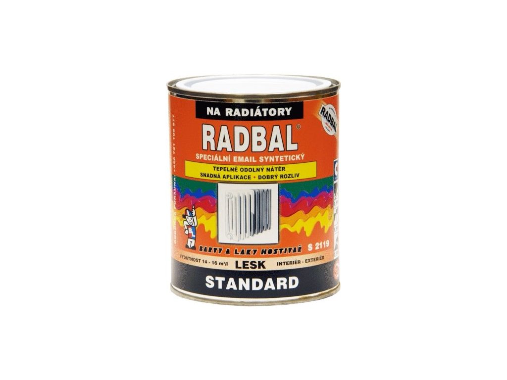 Nátěr radiátorů ústředního topení 1. 1x barva syntetická základní S 2000 U nebo S 2003 Základ na pozink 2. 1 - 2x email na radiátory speciální S 2119 RADBAL Standard. Pro vytvoření dlouhodobé účinnosti nátěru je vhodné email aplikovat ve dvou tenčích vrstvách. Interval mezi jednotlivými nátěry je 24 hodin.