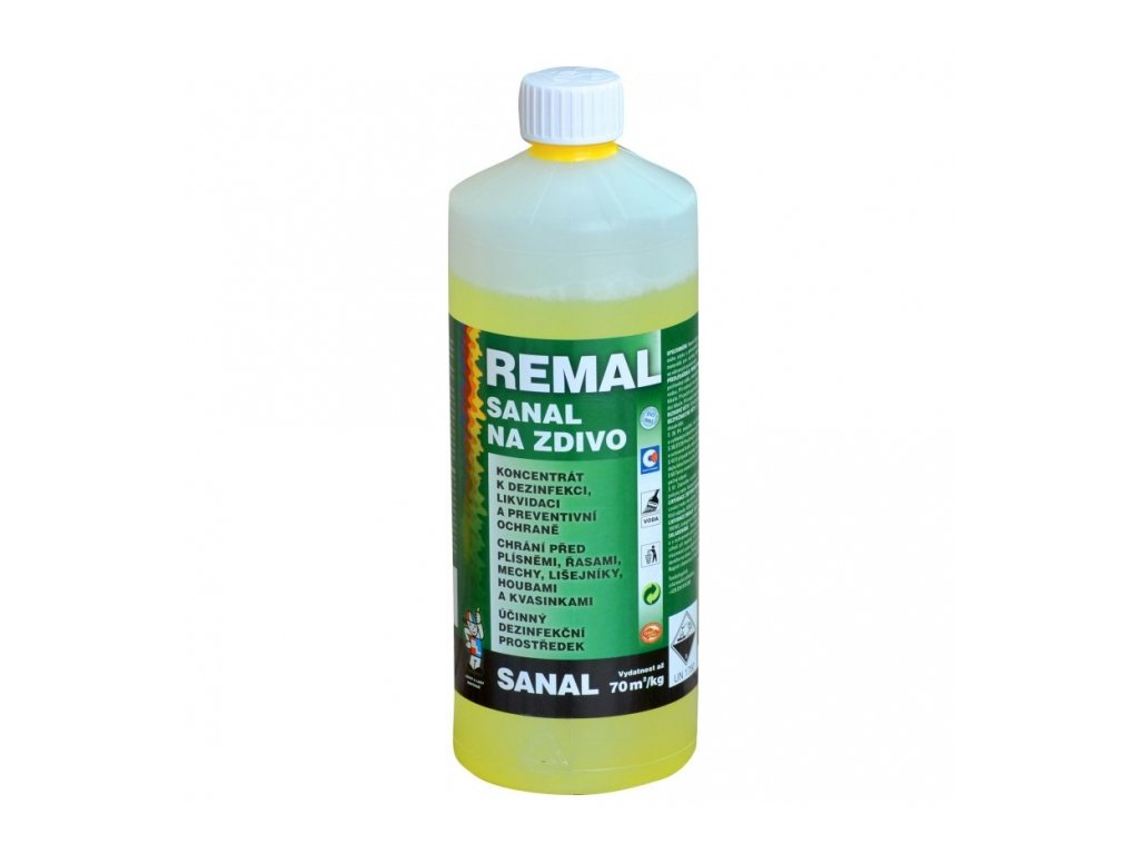 Remal Sanal V1406 na zdivo k sanaci i preventivní ochraně zdiva, omítek, kamene, betonu a jiných stavebních materiálůpři napadení plísněmi, houbami, lišejníky, řasami a bakteriemi. Používejte přípravek bezpečně. Před použitím si vždy přečtěte údaje na obalu a připojené informace o přípravku. Vodný roztok kvarterní amoniové soli s přísadou značkovacího barviva a speciálního aditiva. Výrobek neobsahuje organická rozpouštědla ani těžké kovy. Koncentrát k dezinfekci, likvidaci a preventivní ochraně Chrání před plísněmi, řasami, mechy, lišejníky, houbami a kvasinkami Účinný dezinfekční prostředek Čirá kapalina zbarvená indikačním barvivem Vydatnost: až 70 m2 /1kg zředěného roztoku pro jeden nátěr. Doporučené způsoby aplikace: Štětec, štětka. Ředidlo: Voda. Pracovní postup: Plochy napadené plísněmi je třeba zajistit proti vlhnutí zatékáním a izolací proti vzlínání vody. Před použitím se REMAL SANAL na zdivo V 1406 ředí vodou v poměru 1 : 9, pro ošetření cihlového zdiva se REMAL SANAL na zdivo V 1406 ředí vodou v poměru 1 : 5. Plochy napadené plísněmi se natřou zředěným Sanalem a plísně se zamokra mechanicky odstraní např. špachtlí. Po zaschnutí se nátěr zředěným Remalem Sanal 1–2 krát opakuje. Celková spotřeba zředěného Remalu Sanal aplikovaného popsaným postupem je 250 g/m2. Po vyschnutí ošetřeného povrchu v interieru je vhodné provést nátěr malířským přípravkem s preventivní protiplísňovou přísadou (např. REMAL protiplísňový). Obsah účinných složek: N-alkyl (C12-16) (benzyl) dimethylamoniumchlorid (ES 270-325-2) : 200 g/kg výrobku.Doplňkové parametry
