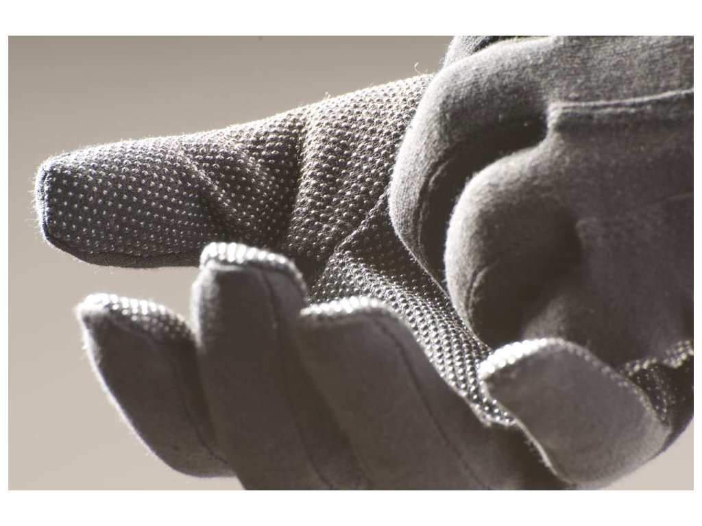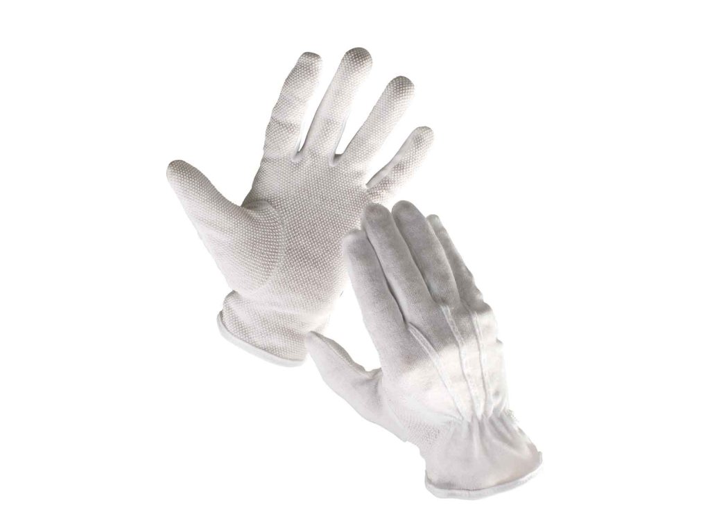 Rukavice šité z bavlny, polomáčené v přírodním latexu, s protiskluzovou úpravou v dlani a na prstech.