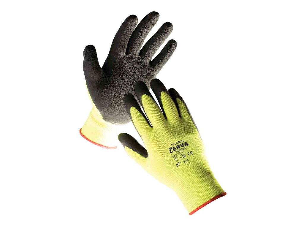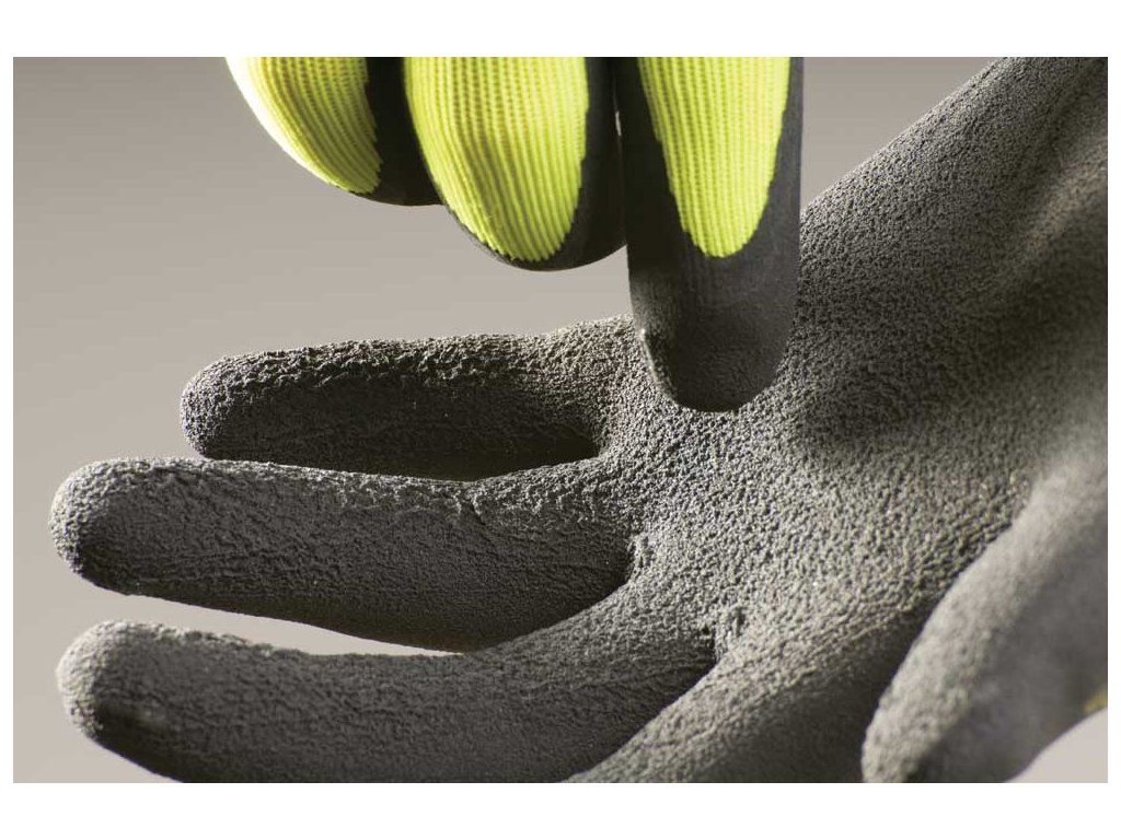 Bezešvé pletené rukavice ze syntetické příze s nánosem latexu na dlani a prstech. Pružná manžeta.Vhodné pro práci, kde se vyžaduje cit v rukách.- Odstín žluto-černý