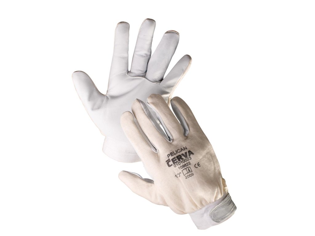 Rukavice šité z jemné lícové kozinky v dlani, bílé bavlněné tkaniny na hřbetu a manžetou na suchý zip.- Velikost 9", 10"