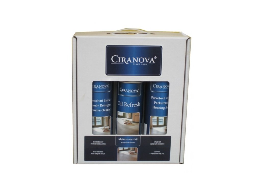 Sada obsahuje - Parketové mýdlo, Intezivní čistič, Olej na péči ve spraji, jemné brusivo a hadřík. ÚDRŽBA PODLAHY NATŘENÉ OLEJEM Údržba podlahy, která je natřená olejem není nijak náročná. Pro běžnou údržbu postačí suchý mop. Nikdy nedoporučujeme příliš mokré vytírání podlahy, může to mít vliv na životnost nánosu oleje. Ochrana olejované podlahy může být zvýšena tím, že pravidelně budete ošetřovat podlahu podlahovým mýdlem CIRANOVA. Stačí smíchat 4-5 malých víček od nádoby s 10 litry vlažné vody. Následně vytírejte podlahu ve směru žilkování dřeva. Poté vyperte a vyždímejte špinavý hadr a vyčkejte 1 hodinu pro dokonalé zaschnutí udržovacího nátěru při pokojové teplotě. Podlahové mýdlo CIRANOVA obsahuje pouze přírodní látky a dodá dřevěné podlaze potřebnou ochranu. PRVNÍ POMOC pro olejovanou podlahu V případě, že Vaše podlaha vypadá velice špinavá a zašlá, je vhodné použít prostředek CIRANOVA Intenzivní čistič. Díky tomuto prostředku vrátíte podlaze zašlý lesk a půvab. Pro údržbu takto ošetřeného povrchu čističem se nanáší jako finální vrstva CIRANOVA Olej na péči ve sprejiDoplňkové parametry