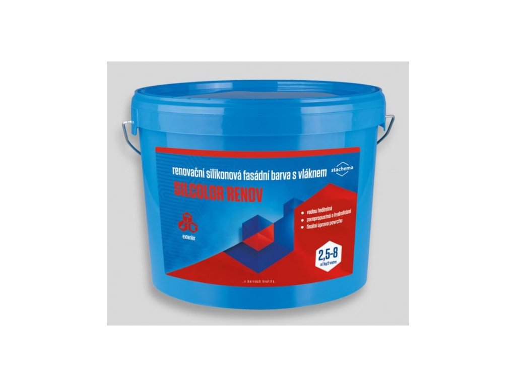 Silikonová barva SILCOLOR RENOV je renovační fasádní barva se speciálními výztužnými vlákny umožňující překlenout statické vlasové trhlinky podkladu. Nátěr vykazuje vysoký účinek proti výskytu řas a plísní. Barva je zejména určena k obnovení a oživení povrchů kontaktních zateplovacích systémů a vyžilých starých fasád. Barva má vysokou přídržnost k podkladu, zajišťuje ochranu a barevné sjednocení podkladu, je paropropustná, vysoce hydrofobní s nízkou špinivostí.- SILCOLOR RENOV je vhodná pro renovaci Vaší špinavé, zašlé nebo vybledlé fasády