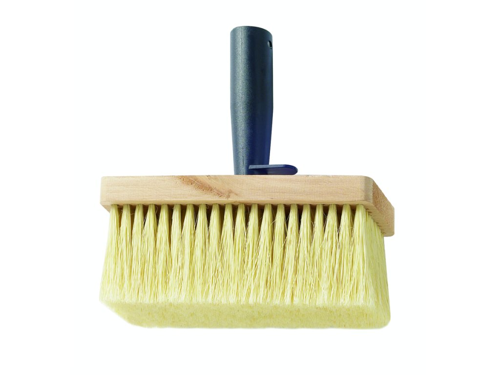 Štětka hranatá Standard na vápno a na ochranné nátěry, mix umělých štětin a fíbru, naražená, dřevěné těleso, umělohmotná montovaná rukojeť a hák Rozměr: 70x170 mmDoplňkové parametry