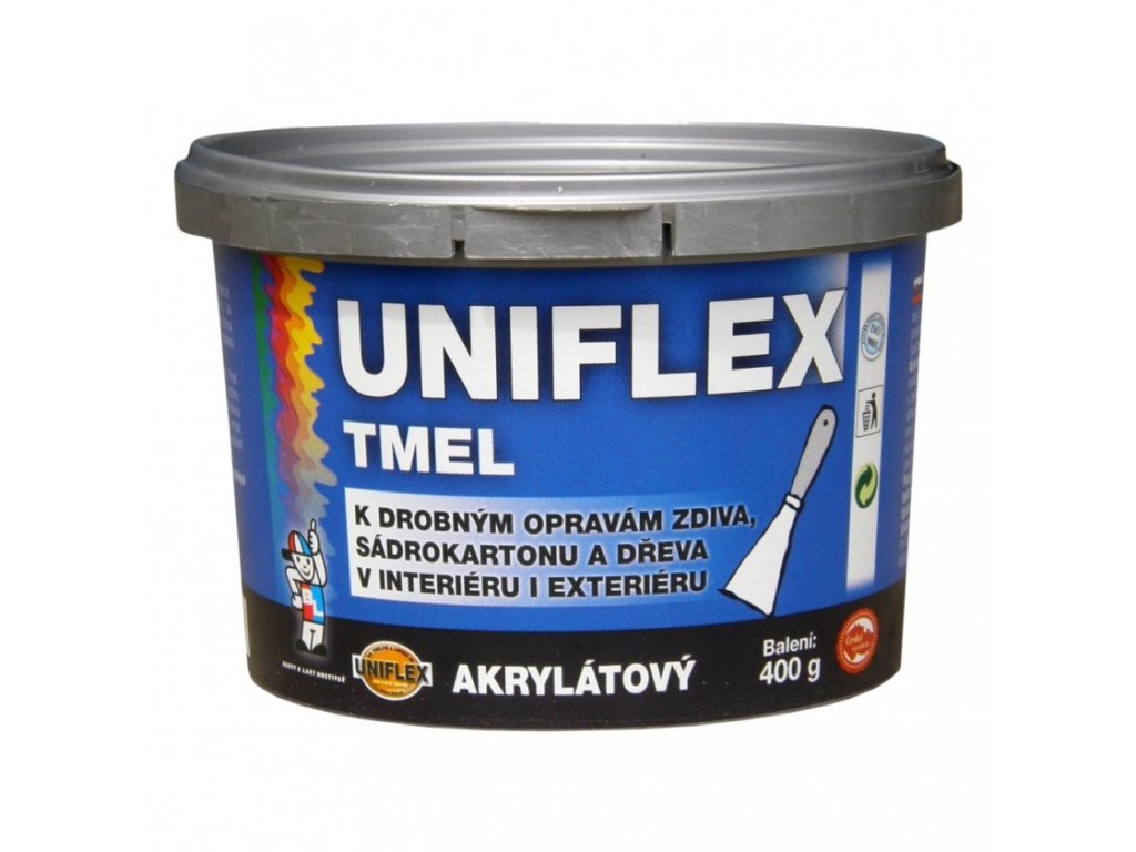 Akrylátový pastovitý tmel k drobným opravám zdiva, sádrokartónu a dřeva v interiéru i exteriéru. Uniflex tmel či lepidlo určené na tmelení středních a větších nerovností, vynikající přilnavost na většině povrchů, především na kov, ocel, kámen, beton, dřevo atd., přetíratelný, pro vnitřní i venkovní použití.Použití: