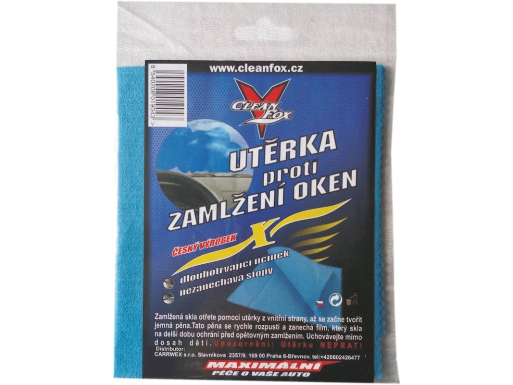 Zamlžená skla se po otření utěrkou z vnitřní strany a vytvoří jemnou pěnu. Tato pěna se rychle rozpustí a zanechá film, který skla na delší dobu ochrání před opětovným zamlžením. Návod k použití: Zamlžená skla otřete pomocí utěrky z vnitřní strany, až se začne tvořit jemná pěna. Tato pěna se rychle rozpustí a zanechá film, kter skkla na delší dobu ochrání před opětovným zamlžením. Uchovejte mimo dosah dětí. Upozornění: Utěrku NEPRAT!Doplňkové parametry