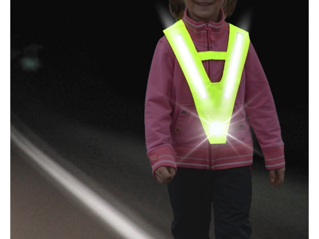 Výstražný reflexní doplněk oděvu ve tvaru V, dobře viditelný na velkou vzdálenost. Určeno pro děti ve věku 4 - 15 let. Jednoduše se nasadí přes hlavu dítěte tak, aby na přední i zadní straně byly dobře viditelné reflexní prvky. Zejména za snížené viditelnosti či v šeru několikanásobně prodlužuje vzdálenost, na kterou je dítě viditelné.Doplňkové parametry